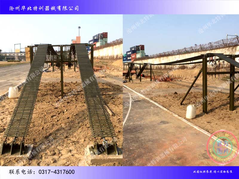 所述障礙物為依次排列的軟橋1、螺旋梯2、高低橫木3、繩網(wǎng)4、輪胎攀臺5、搖擺平臺6、晃動橫梯7、跨網(wǎng)8、阻絕墻9、模擬沙灘10。渡海登島400米障礙場針對渡海登陸作戰(zhàn)的實戰(zhàn)環(huán)境,以提高單兵海上作戰(zhàn)適應能力為重點,遵循體能訓練規(guī)律,按照系統(tǒng)組合的原理,不同程度地模擬裝載、航渡、換乘、搶灘上陸的特殊狀態(tài),集體能、技能和心理訓練為一體,適應渡海登陸作戰(zhàn)訓練需要。