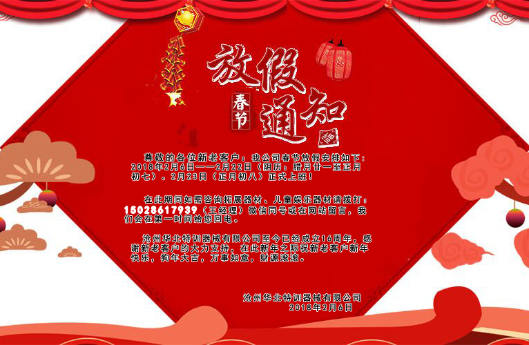 滄州華北特訓器械有限公司至今已經成立16周年,感謝新老客戶的大力支持,在此新年之際祝新老客戶新年快樂,狗年大吉,萬事如意,財源滾滾。 ...