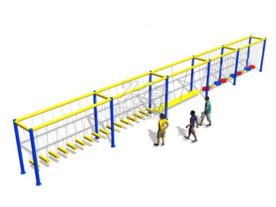 人員從一端手抓鏈條,腳踩輪胎,利用慣性通過倒換輪逐一通過,到達(dá)浪木保持好身體平衡快速通過到達(dá)秋千橋,手抓鏈條,腳踩木板,利用慣性通過倒換木板一通過。