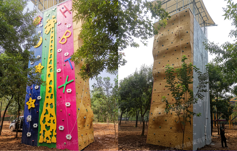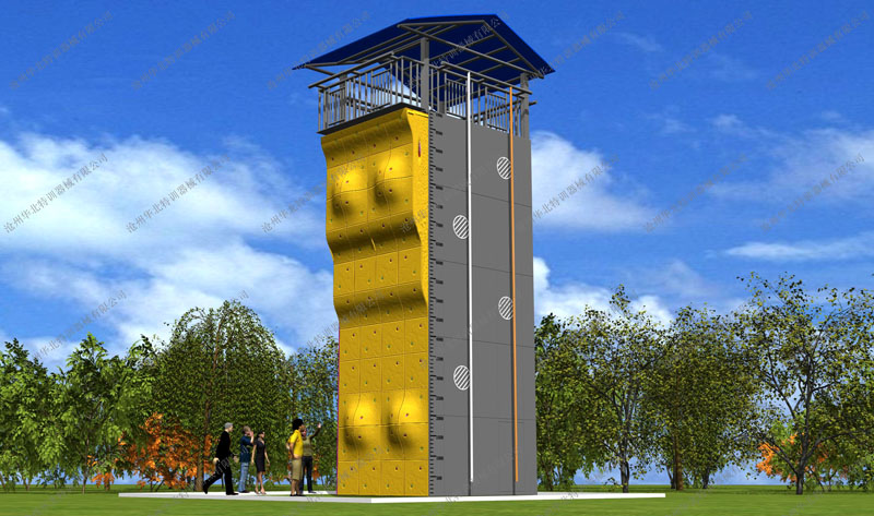 規格:總高12米(不含遮陽棚),平臺高10米。 器械含四面項目:造型攀巖、平面攀巖、趣味攀巖、速