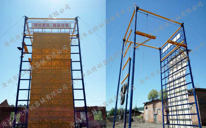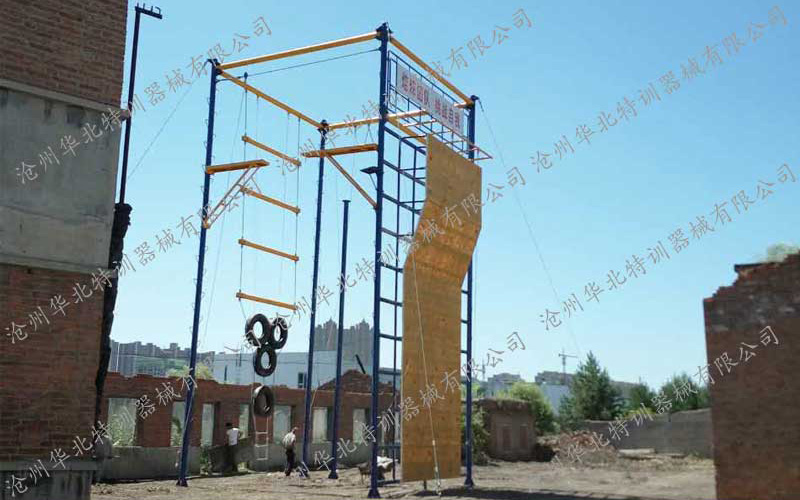 空四面體組合、攀巖(40塊)、單杠、斷橋、天梯4個項目,四米墻、背摔、電網、單人浪木、搭板過橋、安全裝備。