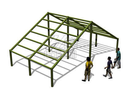 從屋檐爬上障礙,首先從第1根和第2根橫梁間翻至屋面下,而后從第2根和第3根橫梁間鉆出,依此交替通過(guò),以鍛煉受訓(xùn)者身體及四肢的協(xié)調(diào)能力